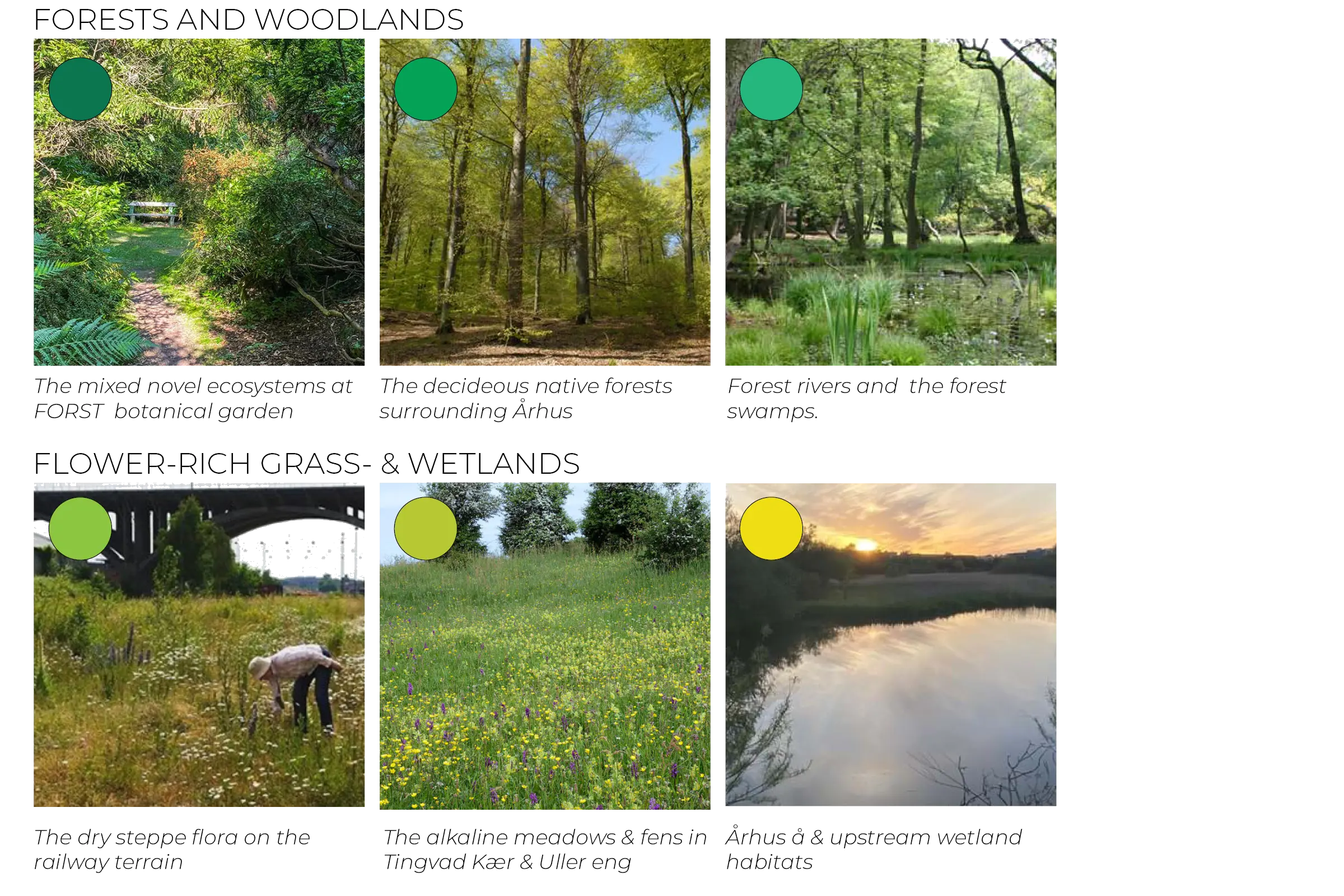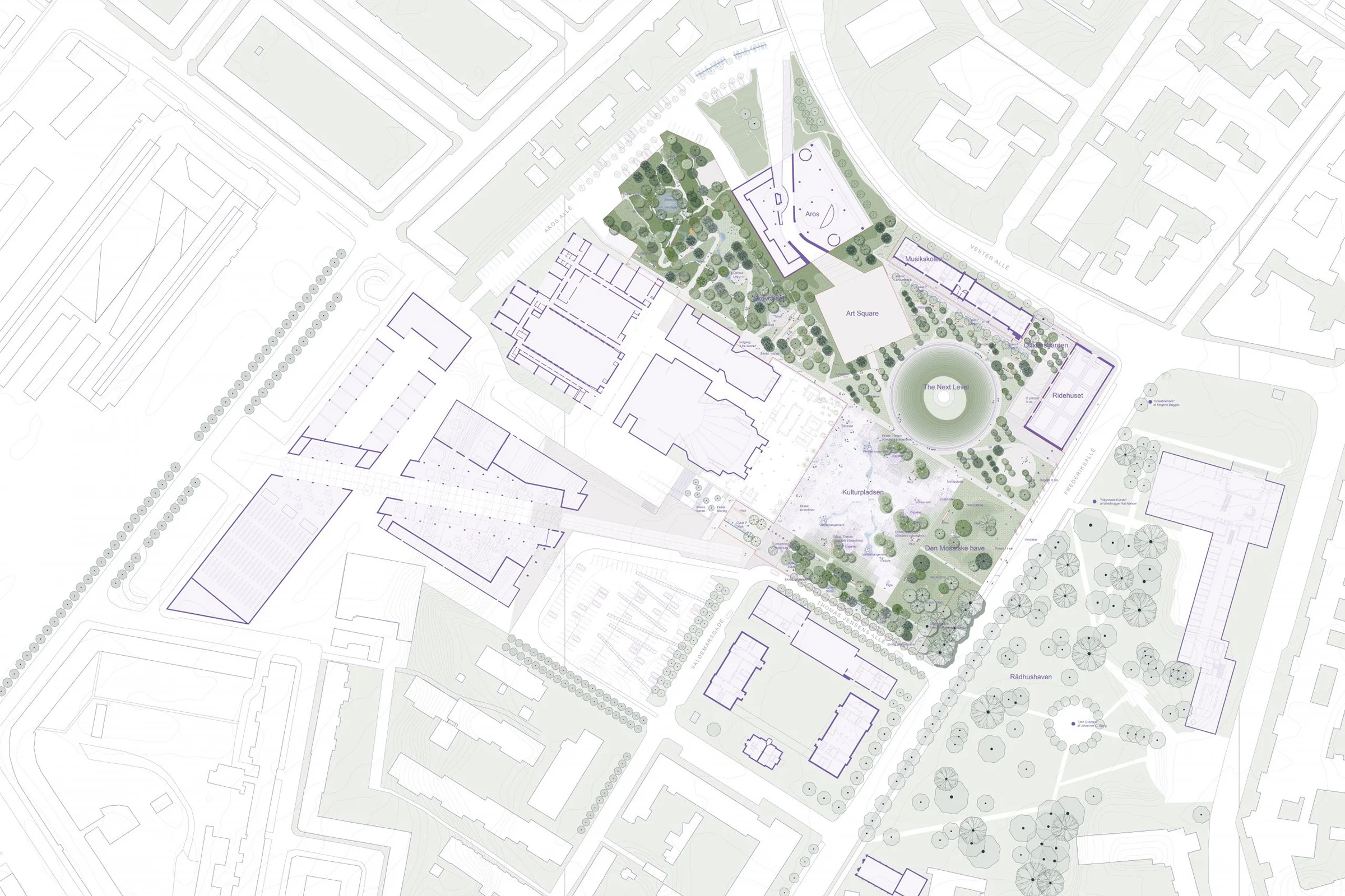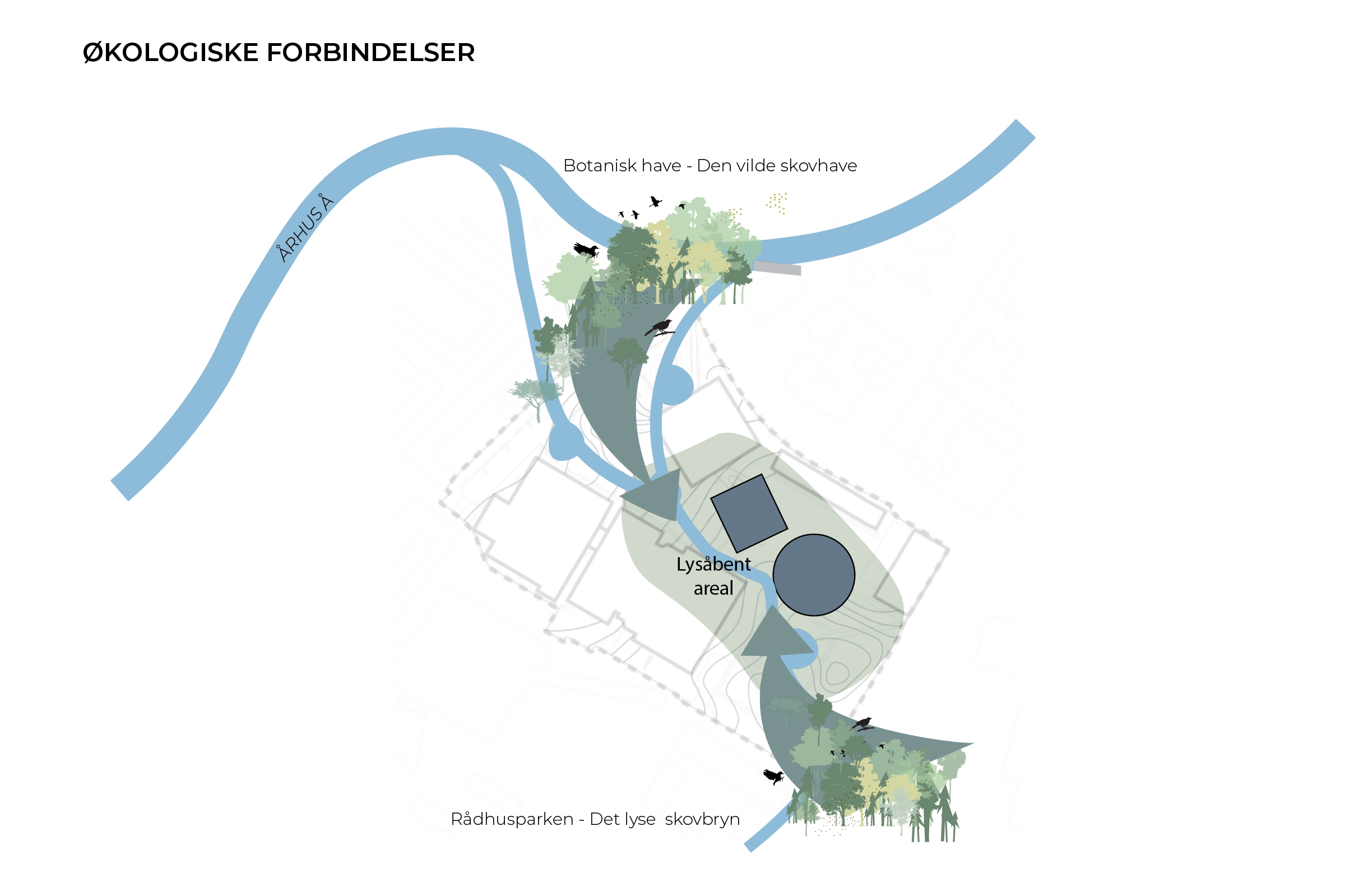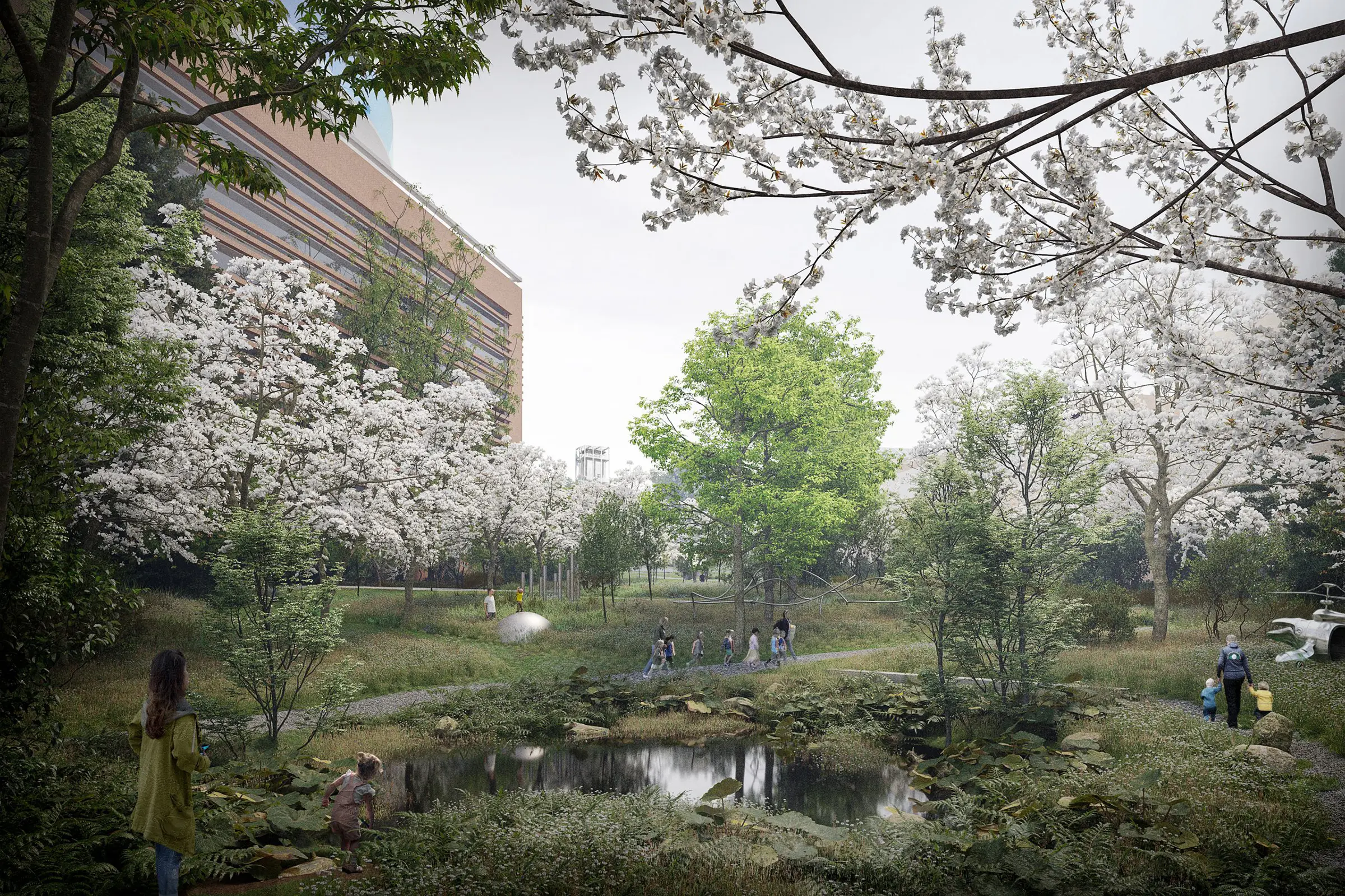 Byens Park er et levende samlingssted for kultur, natur, byliv og sociale møder. Det skaber plads til naturen, hvor biodiversitetsstrategien hægter sig på Århus særegne natur og parker, og skaber et naturrigt strøg i én stor sammenhængende grøn struktur, hvor parken væves sammen til et landskab fuld af oplevelser, kunst og biodiversitet. Som gennemgående træk udspiller forårets hvide bølge sig som et langsomt skuespil, hvor træer og buske hylder lysets tilbagekomst med et blomstrende hvidt forårsflor.