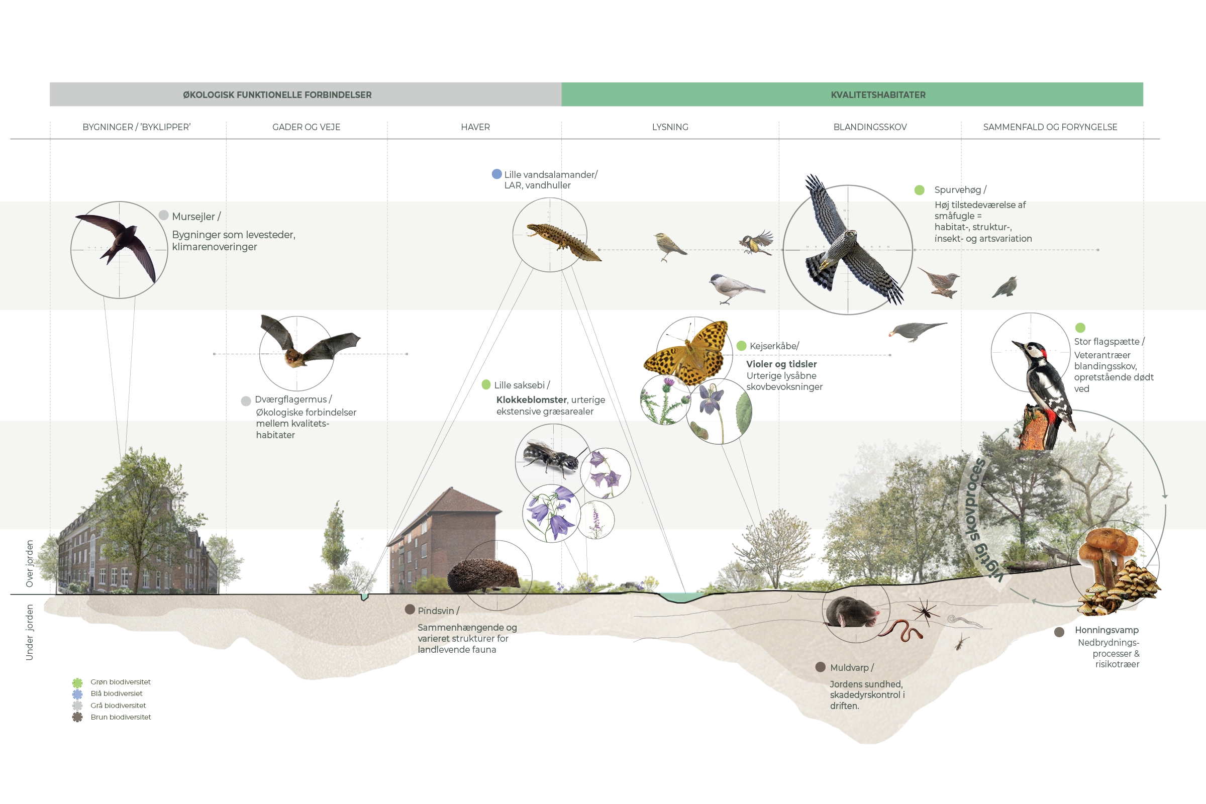 Kejserkåbe, Spurvehøg, Stor flagspætte, Lille saksebi, Muldvarp, Pindsvin, Lille vandsalamander, Honningsvamp, Dværgflagermus, Mursejler