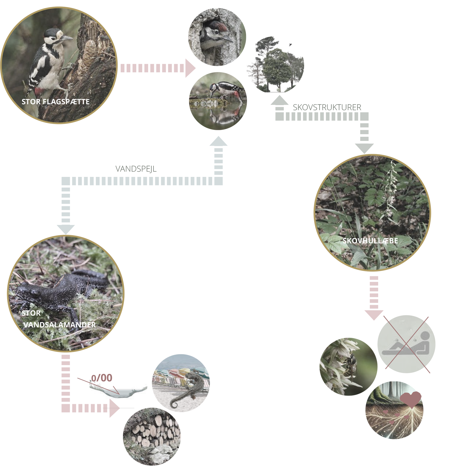 Landskabet behandles med nænsomhed og respekt. De eksisterende grønne træk i Hjortespring videreføres med blik for sammenhænge og artsdiversitet. Her formes det nye i pagt med det stedbundne – på landskabets præmisser. Udvalgte fokusarter fungerer som biologiske indikatorer og sikrer variation og dybde i vegetationen. Samtidig bliver de en formidlingsnøgle, som gør naturens rigdom mere nærværende og forståelig for områdets beboere og besøgende.