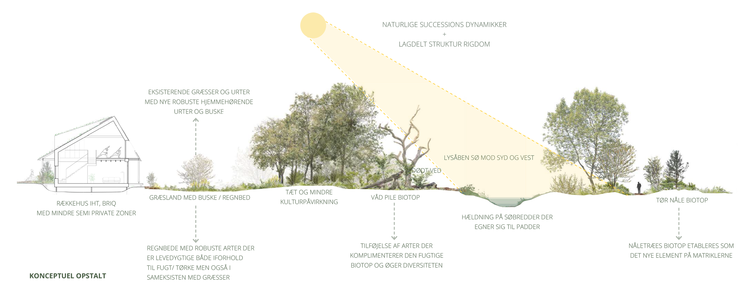 Her skabes rammerne for fællesskaber og grønne fællesrum – små haver og en grøn fælled hvor både flora, fauna og mennesker kan finde plads til at gro. Biodiversiteten er ikke blot et resultat, men en integreret målsætning, der driver både design og drift – en investering i naturens mangfoldighed som grundlag for en levende, modstandsdygtig og bæredygtig bydel.
