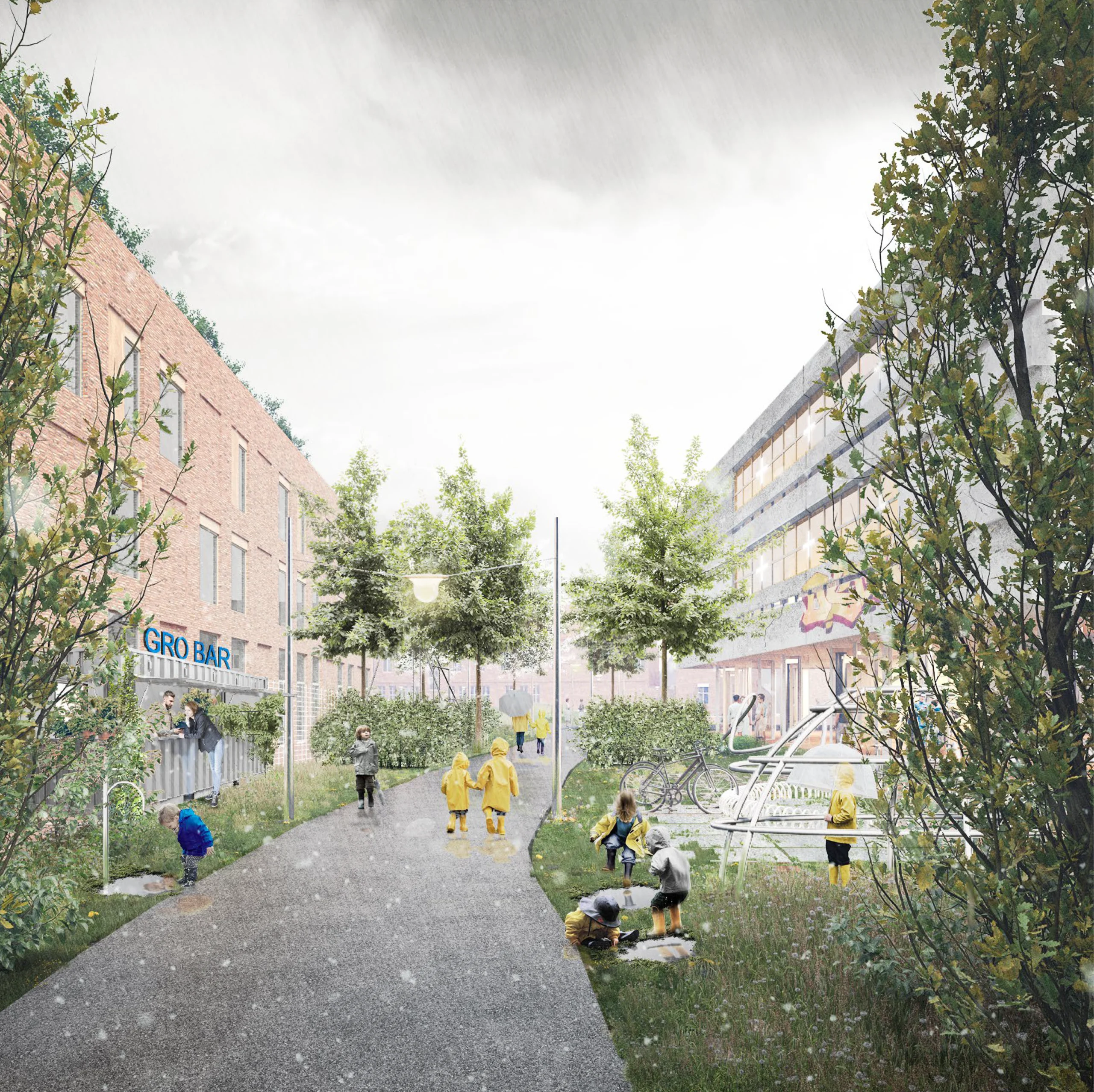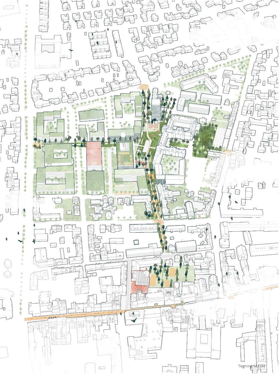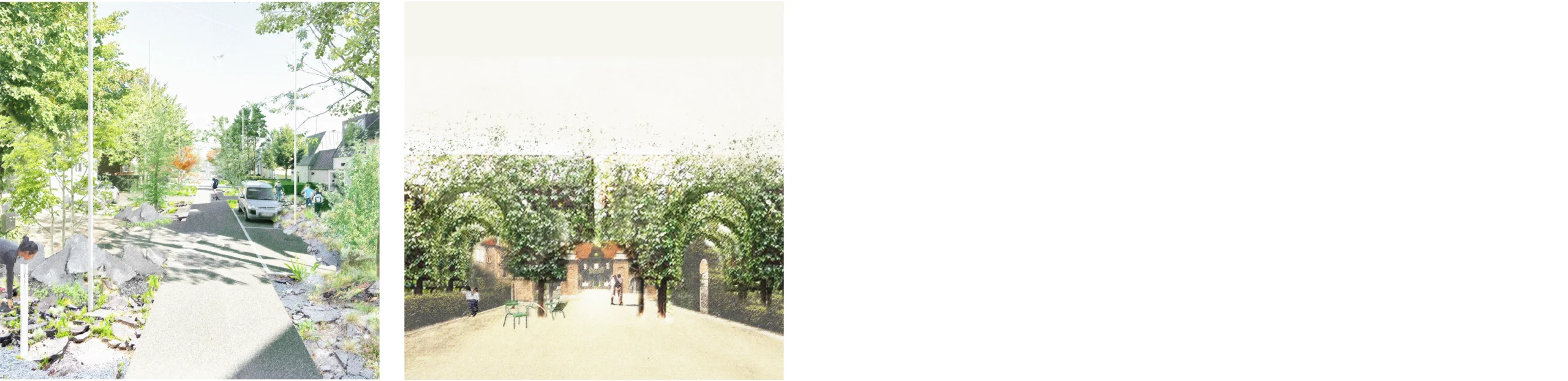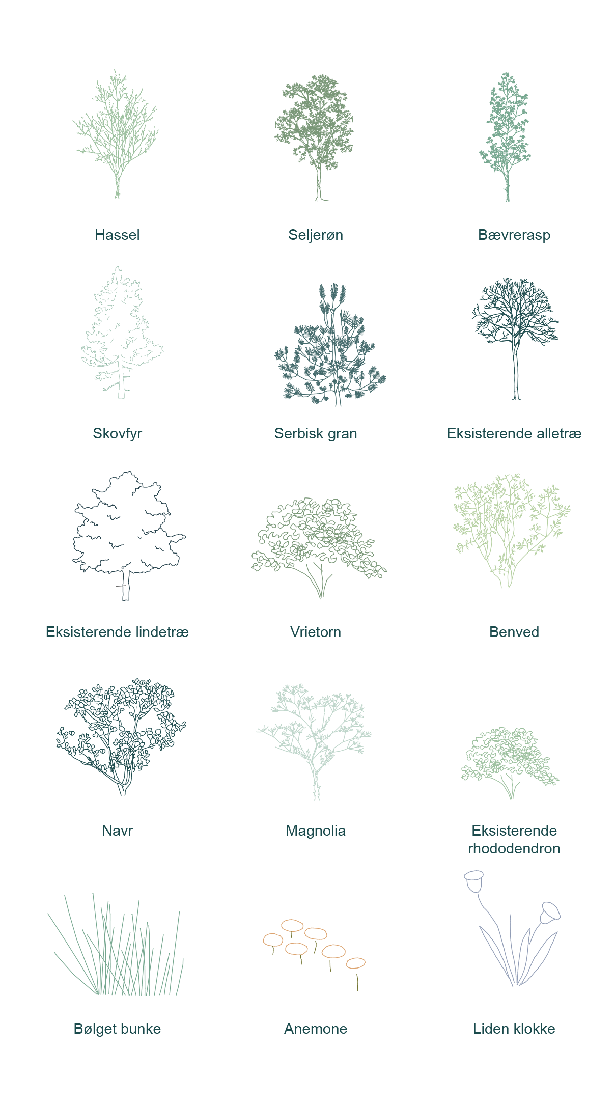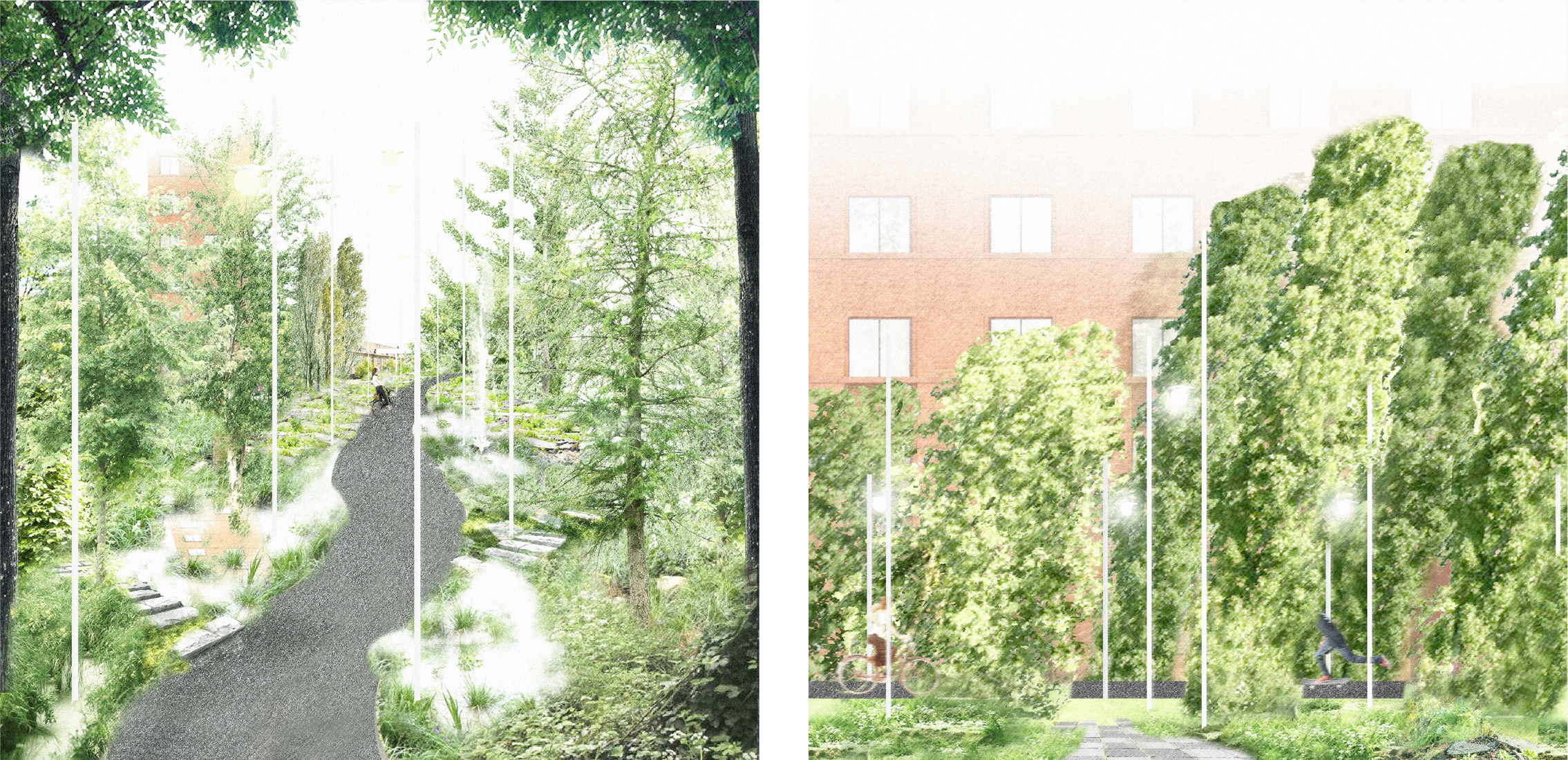 BEPLANTNINGSSTRATEGI MED JORD, KLIMA OG KULTUR I FOKUS. Forslaget arbejder med en stedsspecifik beplantningsstrategi, der tager udgangspunkt i jordbundsforhold, sol og vind samt Hernings gartnertradition. Landskabets struktur og karakter skabes gennem et bevidst samspil mellem bynaturens skala og den midtjyske flora: plantager, krat og hede placeres, hvor de trives bedst, og danner grønne rum med stærk sæsonvariation. Alléer genetableres i en ny og mere artsrig form, og arbejder både som forbindelser og som levesteder for biodiversitet. Byparken bliver et centralt, åbent landskabsrum, med vilde græsser og en stor naturplæne ovenpå parkeringskælderen.
